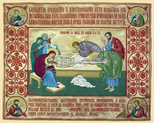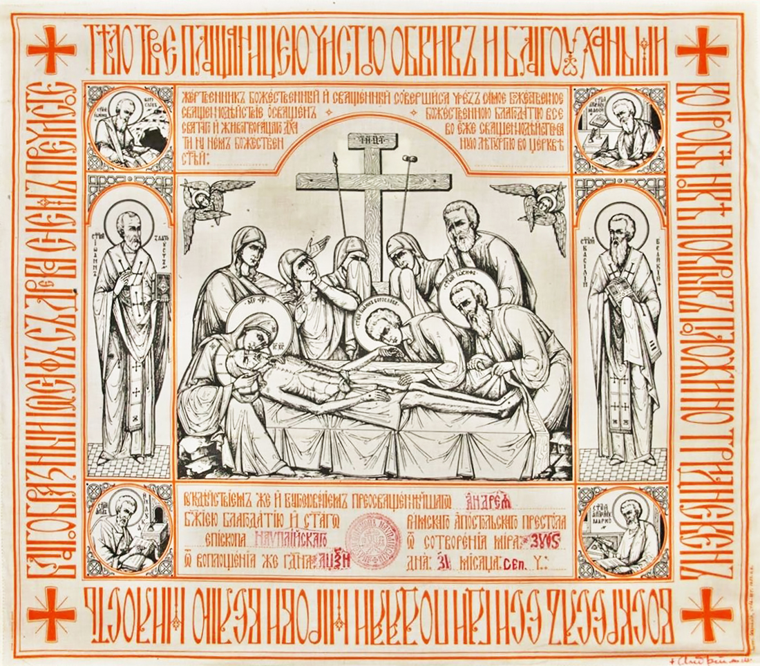 На антиминсах изображается положение во гроб Иисуса Христа после снятия с Креста, орудия Его казни, и четыре евангелиста.
