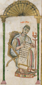 Ап. Иоанну Ангел шепчет на ухо текст Евангелия от Иоанна, открытого на «В начале бе Слово» (Иоанн Богослов в молчании, Нектарий Кулюксин, 1679 год, Эрмитаж)