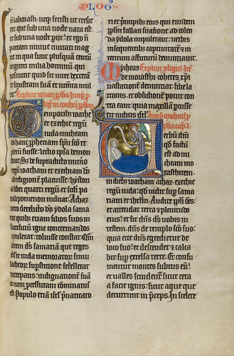 В этой Библии 1200-х годов буква V обозначает ветхозаветную книгу Михея. Сцена внутри письма иллюстрирует следующий текст: «Слово Господне, которое было к Михею Морафиянину...» К своему изображению сцены иллюстратор добавил детали, не упомянутые в тексте, изображая пророка Михея в постели, в то время как ангел, подняв руку в речевом жесте, произносит «слово Господне», представленное свитком. Хотя он появляется в постели, ясно, что Михей не спит; его глаза открыты, и он смотрит на ангела, стоящего рядом с кроватью.