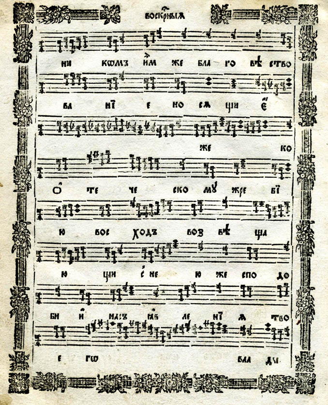 Именно в такой нотации в 1772 году Синодом в Москве был выпущен свод основных церковных песнопений — 4 певческие книги (Обиход, Ирмологий, Октоих и Праздники), которые впоследствии неоднократно переиздавались. Дополнительно, в 1778 году в Москве был издан «Сокращённый Обиход нотного пения», в котором квадратной нотой были записаны наиболее ходовые песнопения из всех четырёх книг. Это издание получило всеобщее распространение и было принято в качестве первоначального руководства при обучении церковному пению в духовных учебных заведениях. В 1899 году (также в киевской нотации) была выпущена Триодь постная и цветная.