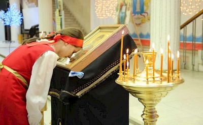 Целование святынь (Евангелия, Креста, мощей, икон) — выражение любви и поклонения; подходить не спеша, без тесноты; два поклона перед, один после; целовать в ножку/ручку/волосы в зависимости от изображения.