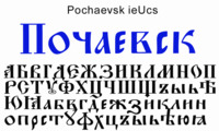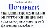 Оригинальная гарнитура применялась в богослужебных книгах прошлого века, издаваемых типографией Почаевской Лавры. За основу Pochaevsk Ucs была взята достаточно точная ее цифровая версия Pochaevsk. В разных вариантах шрифтов встречаются указания на разных дизайнеров: Orthodox Information Data Associates (год неизвестен); Starin, Russian Antiquities, developed by Nikita Simmons (1996); Archbishop John (1999). |