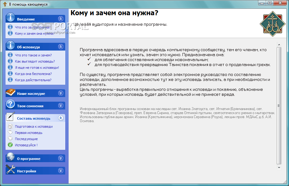 В помощь кающемуся - программа адресована тем, кто хочет исповедаться или узнать, зачем это нужно, а предназначена она для облегчения составления исповеди новоначальным. |