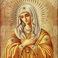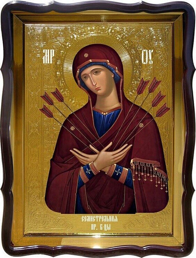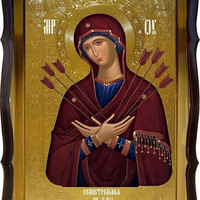 На Семистрельной иконе Пресвятая Богородица изображается без Богомладенца, склонившей Свою главу к правому плечу и пр...