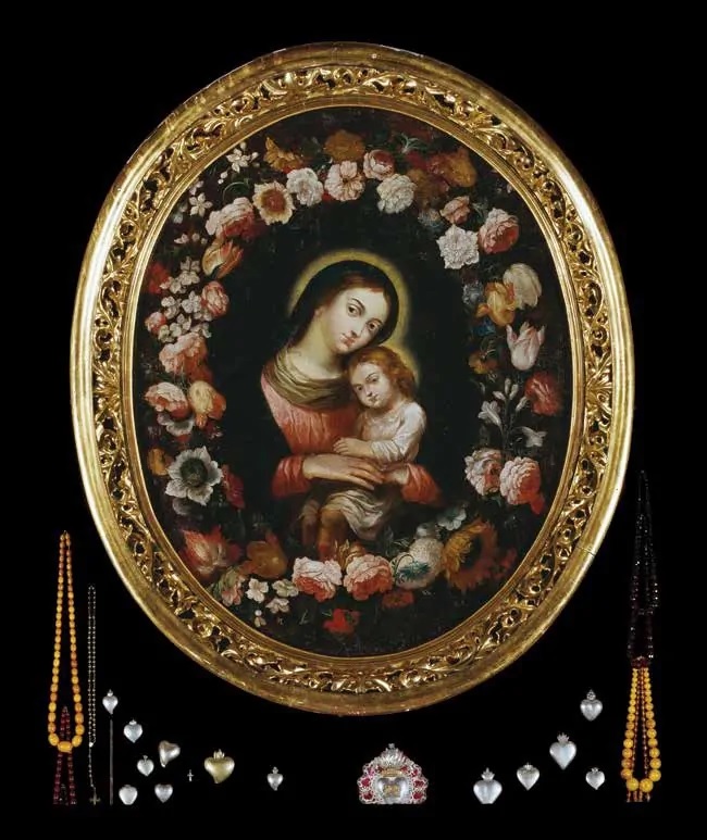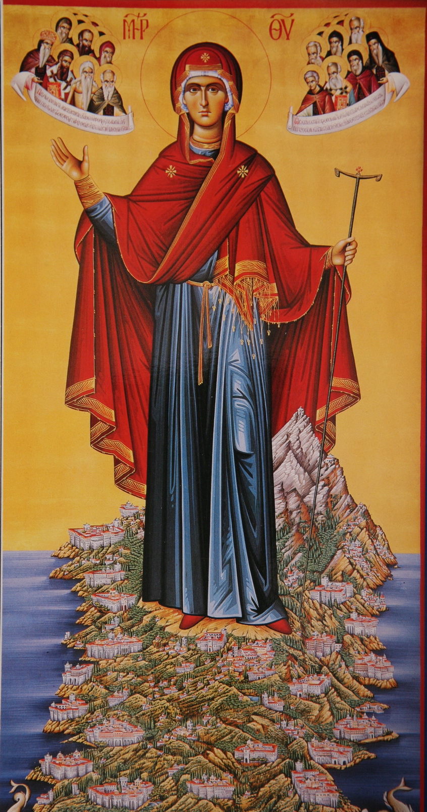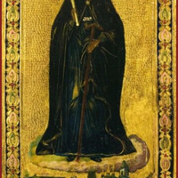 Богоматерь на сей иконе изображена в виде монахини с жезлом и четками в левой руке и свечой в правой...