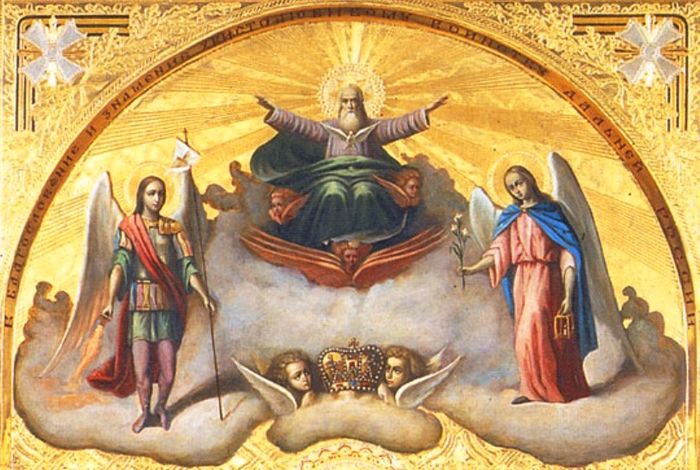 Икос 1 Архангелов и Ангелов начало, Властей, Престолов, Господствий, Сил Небесных, Херувимов и Серафимов и всего мира Творче, Судия и Господи отверзи ми, яко же Моисею недоуменный ум и язык на славословие чудного Твоего имени, да вопию Ти таковая: