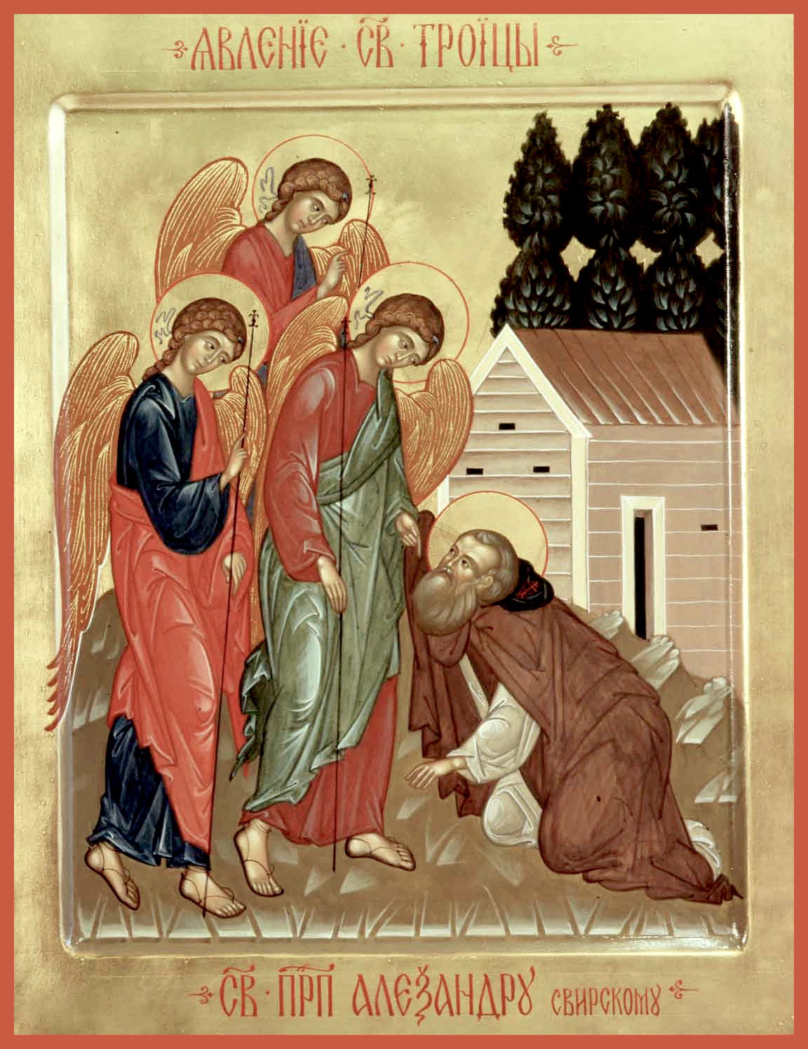 Кондак 8 Страннолепно явися ти на воздусе ангел Господень в мантии и куколи иночестем, указуяй место, на немже храм во имя Живоначальныя Троицы имел еси создати в пустыни Свирстей, преподобне отче, егоже Божиим поспешением совершив и освятив, со ученики твоими немолчныя хвалы возсылал еси в нем Господеви, зовый: Аллилуиа.
