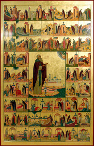 Кондак 9 Всяко слово к похвалению ангелоподобнаго жития твоего недовольно зрим быти, преподобне отче: како бо можем того по достоянию ублажити, егоже Сам Бог дивно прославляет? Тело бо его, на земли тлению непричастное, чудес реки источает, всякия целит болезни и бесы прогоняет, душа же его святая с двадесять четырьми старцы поет вечно в небеси Седящему на Престоле: Аллилуия.