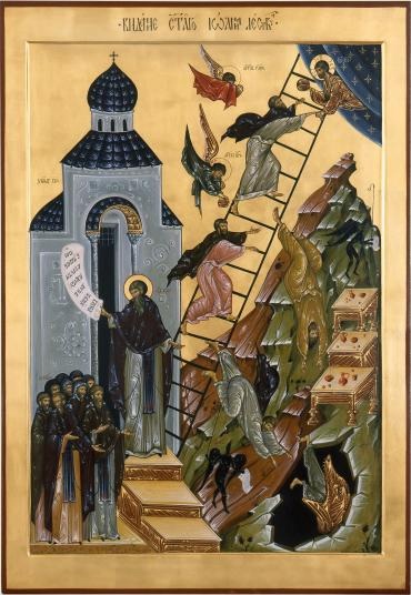 Кондак 10 Спасения хотящих достигнути писание твое, «Лествицею» именуемое, наставляет к трудам, самоотвержению и подвигам крепким, омывает же нечистоты́ греховныя, страсти и пороки искореняя, и сим образ Божий в человеке восставляет. Восходя по «Лествице» твоей грешник обретает спасительный путь покаяния, поучается непрестанно пети Богу: Аллилуиа.