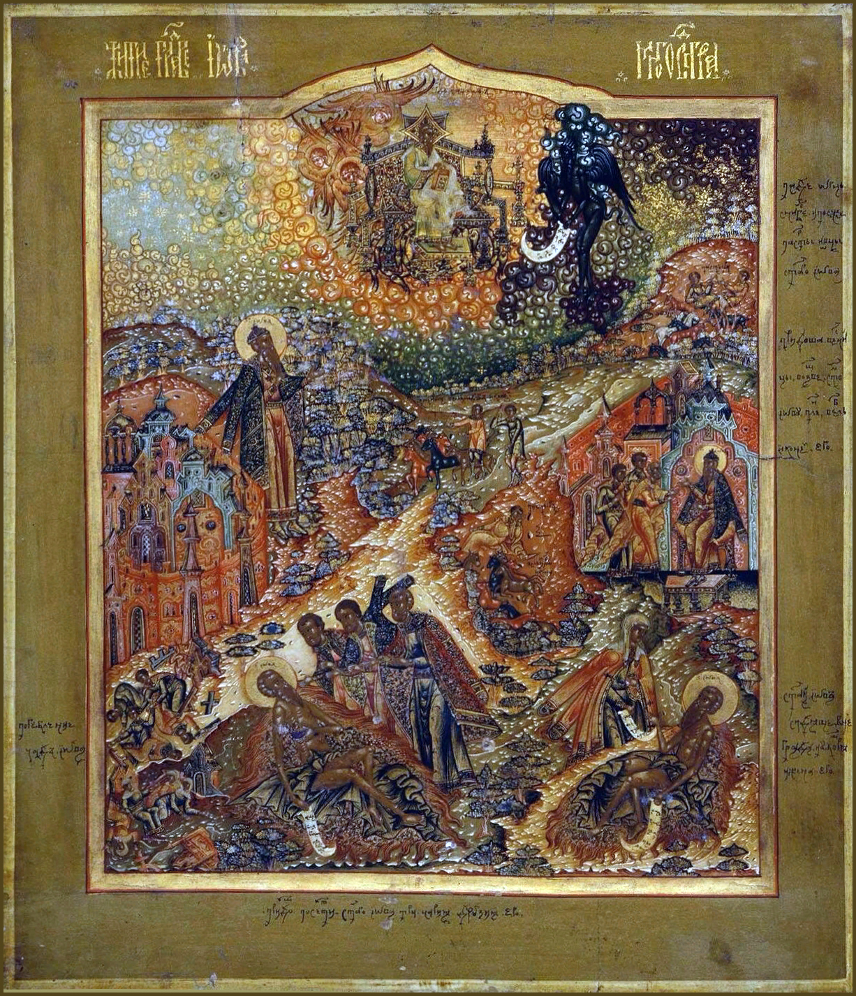 Икос 2 Разумом своим злым зело обрадовася диавол, таковое изволение Божие получивый. Во един день, егда вся чада Иовля единодушно в доме старейшаго брата своего трапезою наслаждахуся, посла диавол исполнители злые воли своея, и все имущество Иовле погуби, и десятерицу чад его смерти предаде. Буря нечаянных искушений не поколеба сего дивнаго столпа, и из уст его изыдоша сицевая мудрая словеса: Наг изыдох аз от чрева матере моея, наг и отъиду тамо: Господь даде, Господь отъят: яко Господеви изволися, тако бысть. Буди Имя Господне благословено во веки! Чтуще таковую преданность воли Божии праведника, мы в похвалу Иова сице глаголем: Радуйся, Иове, ничимже пред Господем согрешивый. Радуйся, Многострадальне, и устнама своима безумия Богу не давый. Радуйся, яко двери дома твоего выну отверсты бяху всякому мимошедшему. Радуйся, яко странник вне дома твоего не оставашеся. Радуйся, яко ты вдовича слезнаго ока не презрел еси. Радуйся, око слепым, нога же хромых был еси. Радуйся, яко хлеб свой николиже един вкушал, сирым же обильно давал еси. Радуйся, яко вси немощнии, чесого требующии, вся от тебе радостно получали суть. Радуйся, яко о всяком немощнем ты плакал еси. Радуйся, яко видя мужа в скорбех, тяжко вздыхал еси. Радуйся, во всякой нужде и печали скорый помощниче. Радуйся, ищущым предстательства твоего неусыпный заступниче. Радуйся, Иове Многострадальный, всему миру учителю предивный.