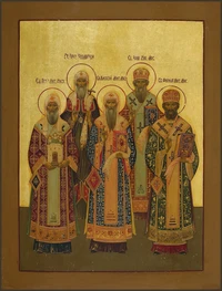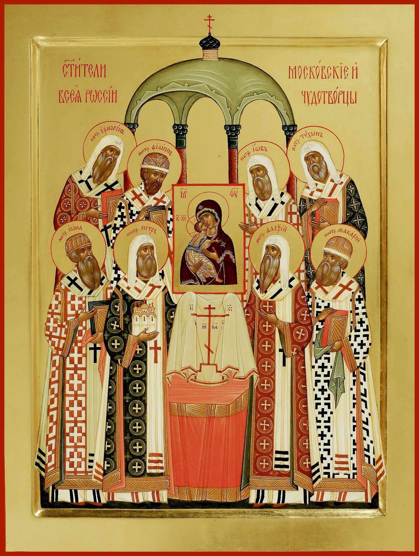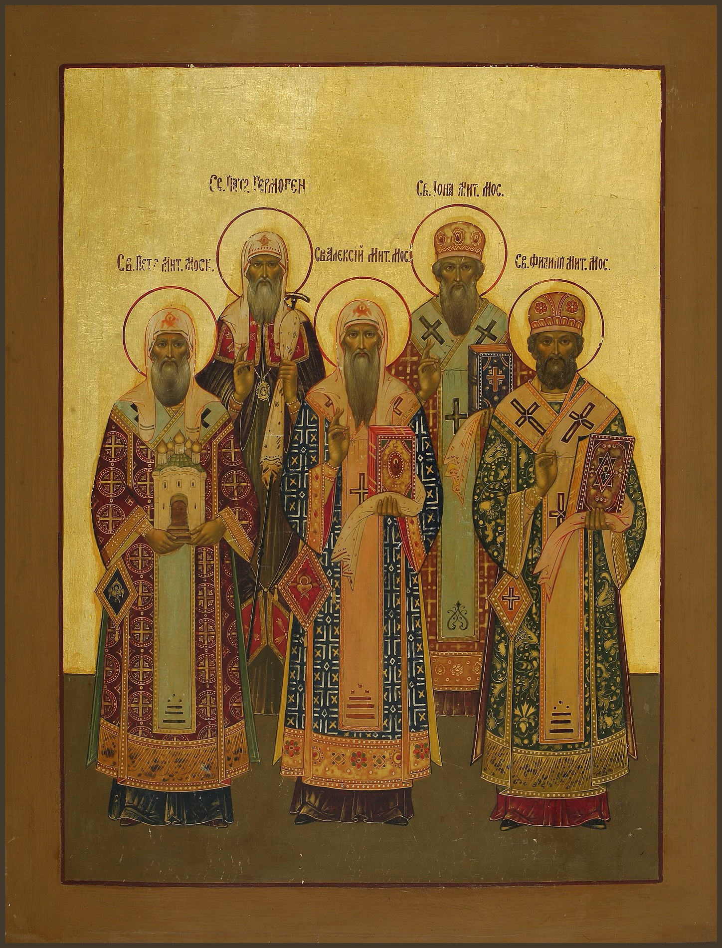 Память: 3 января (21 декабря), 6 сентября (24 августа), 18 (5) октября, 22 (9) января, 16 (3) июля, 18 (5) октября, 25 (12) февраля, 2 июня (20 мая), 18 (5) октября, 2 марта (18 февраля), 25 (12) мая, 18 (5) октября, 13 апреля (31 марта), 9 июня (27 мая), 28 (15) июня, 18 (5) октября Глас 8. Припев: Святи́телие Моско́встии Пе́тре, Алекси́е, Ио́но, Фили́ппе и Ермоге́не, моли́те Бо́га о на́с. |