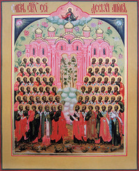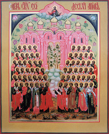 Пе́снь 9. Ирмо́с: Вся́к земноро́дный да взыгра́ется, Ду́хом просвеща́емь, да торжеству́ет же безпло́тных умо́в естество́, почита́ющее свяще́нное торжество́ Богома́тере, и да вопие́т: ра́дуйся, Всеблаже́нная Богоро́дице, Чи́стая Присноде́во. Исцели́ на́ша, Христе́, сокруше́ния серде́чная моли́твами возлюби́вших Тя́ и пропове́давших во все́х язы́цех Бо́га ку́пно и Го́спода, Соде́теля все́х, и и́дольское все́ омраче́ние отгна́вших све́том пропове́дания. Я́коже мо́лния, ми́р освети́ша Лука́ вку́пе и Е́рм, Ма́рк и Ана́ния и с Матфи́ем свяще́нный Оли́мп и ве́рных исполне́ние я́ве просвети́ша, я́же ве́рою дне́сь почти́м свяще́нными и честны́ми песнопе́ньми. Ста́нем благогове́йно в дому́ Бо́га на́шего и ублажи́м священнопропове́дники и учи́тели, и ангелому́дрыя, и богати́тели, спаси́тели же, и защи́тники, и предста́тели все́х су́щия, чту́щих и́х па́мяти. Озари́шася све́том невеще́ственным Ду́ха Аки́ла, Аха́ик, Луки́й сла́вный и Фуртуна́т с шестию́десять и шестию́ Христо́выми уго́дники и свяще́нными ученики́ и сердца́ все́х озаря́ют светоно́сною и́х па́мятию дне́сь. Богоро́дичен: Сия́ние блиста́ния Рождества́ Твоего́ просия́, и уясни́ всю́ подсо́лнечную, и предста́теля тмы́ погуби́, Богороди́тельнице Всечи́стая, а́нгелов хвало́ и челове́ков все́х спасе́ние, непреста́нными гла́сы восхваля́ющих Тя́.
