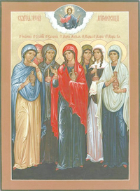 Пе́снь 7. Ирмо́с: О́троцы евре́йстии в пещи́ попра́ша пла́мень дерзнове́нно и на ро́су о́гнь преложи́ша, вопию́ще: благослове́н еси́, Го́споди Бо́же, во ве́ки. Неду́ги отгна́ла еси́ разли́чныя, споспешеству́ющаго тебе́ Сло́ва иму́щи, Ему́же предстои́ши ны́не, вопию́щи, мироно́сице: благослове́н еси́, Го́споди Бо́же, во ве́ки. Еди́на ви́дела еси́ пре́жде ине́х, живота́ на́шего Христа́ воста́вша, вертогра́даря же Того́ непщева́ла еси́, вопию́щи: благослове́н еси́, Го́споди Бо́же, во ве́ки. Богоро́дичен: Уста́вила еси́ тече́ние сме́ртное, Безсме́ртнаго Бо́га я́ко заче́нши и ро́ждши, Чи́стая, Ему́же вси́ пои́м: благослове́н еси́, Го́споди Бо́же, во ве́ки.