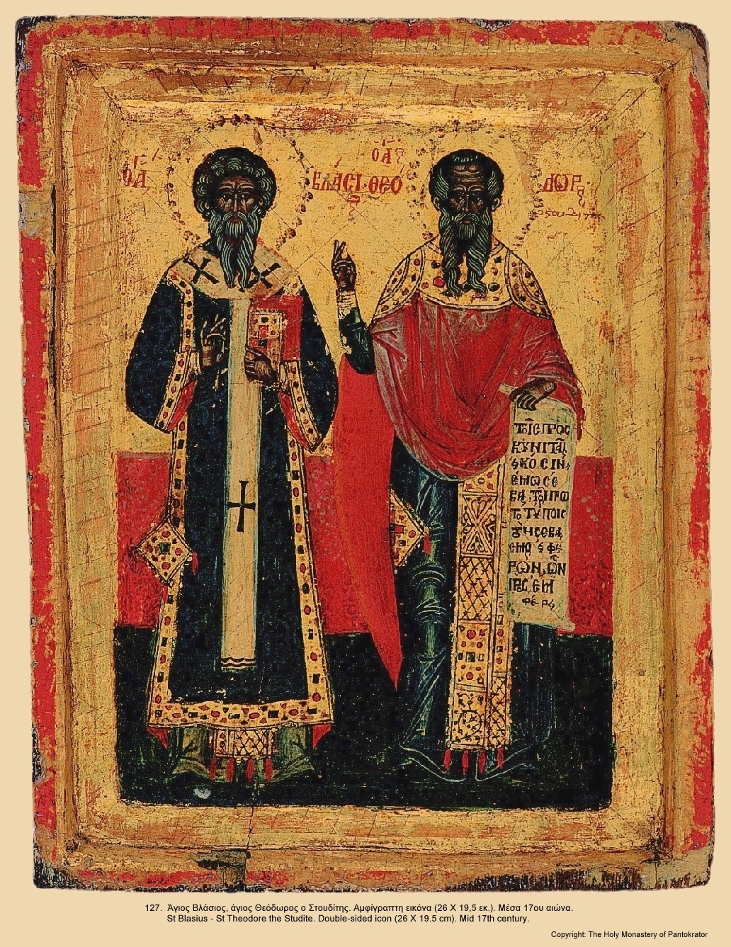 Пе́снь 3. Ирмо́с: Утвержде́й в нача́ле небеса́ ра́зумом и зе́млю на вода́х основа́вый, на ка́мени мя́, Христе́, за́поведей Твои́х утверди́, я́ко не́сть свя́т, па́че Тебе́, Еди́не Человеколю́бче. Вжиля́емь Христо́вым, всеблаже́нне, всеору́жием, я́зв боле́зни претерпе́л еси́, ураня́емь лю́те и в темни́це заключа́емь, я́ко о́бщник страсте́й и Ца́рствия бы́л еси́. Богопокрыва́емь я́ве и Того́ ре́вностию разжига́емь, скве́рная уче́ния беззако́нных разруши́л еси́ твои́ми уче́нии, всему́дре, благода́тию бо от Бо́га, о́тче, обогати́вся досто́йно. В виде́нии де́лателен, в дея́нии богосло́в бы́л еси́ на́м, богоглаго́ливе, по́стник учи́телен, священному́ченик сла́вен, Правосла́вия сто́лп, Це́ркве утвержде́ние. Богоро́дичен: Соприсносу́щное Отцу́ и Ду́ху Бо́г Сло́во обнови́ти восхоте́в родонача́льника, по Ипоста́си того́ из Тебе́, Чи́стая, прия́т, святе́йшу все́х Тя́, Богома́ти, обре́т.