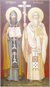 Седа́лен, гла́с 4. Я́ко све́тлость от восто́ка тя́ Христо́с возсия́в, к за́паду, о́тче, посла́ му́дра учи́теля Мефо́дия все́м, просвеща́юща гра́ды мно́ги и страны́ бу́квами твои́ми, почита́юща, богодухнове́нный блаже́нне, уче́ния Ду́ха Пресвята́го, ны́не моли́ся непреста́нно о хва́лящих тя́.