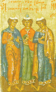 Пе́снь 4. Ирмо́с: Из горы́ приосене́нныя, Сло́ве, проро́к, еди́ныя Богоро́дицы, хотя́ща воплоти́тися богови́дно усмотри́ и со стра́хом славосло́вяше си́лу Твою́. От ко́рене волше́бна тро́ица благослове́нная, отца́ неблагочести́ва, ма́тере же благоче́ствующия, му́ченик прозябе́, бра́тия, возрасти́вшии плоды́ благоче́стия. Зве́зды неле́стны бы́сте ве́ры, я́ко со́лнце, я́ве возсия́вше ми́ру, трисия́нная тро́ица, светоно́сный Ману́ил, Саве́л и со Исма́илом. Моли́теся трие́, я́коже еди́н, Тро́ице да́ти очище́ние и оставле́ние согреше́ний творя́щим ве́рою и́стинною, святи́и му́ченицы, па́мять ва́шу. Богоро́дичен: Пала́та красна́ все́х Царя́ показа́ся вои́стинну, и престо́л Вы́шняго, и вы́шши тва́ри Богома́ти, и Предста́тельница ду́ш на́ших.