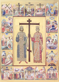 Конда́к, гла́с 3. Константи́н дне́сь с ма́терию Еле́ною Кре́ст явля́ют, всечестно́е дре́во, все́х у́бо иуде́ев посрамле́ние су́ще, ору́жие же на проти́вныя ве́рных царе́й: на́с бо ра́ди яви́ся зна́мение ве́лие и во бране́х гро́зное. И́кос: Константи́на, ве́рнии, с ма́терию почти́м: Дави́да бо и си́и словеса́ услы́шавше, на ке́дре, и пе́вге, и кипари́се, тресло́жный Кре́ст позна́ша, и́мже спаси́тельная стра́сть после́дова, и вся́ предста́виша иуде́и, угото́витися показа́ти лю́дем ве́лие оправда́ние, сокрове́нное за́висти ра́ди и не́нависти те́х, и, сие́ обре́тше, показа́ша они́. Сего́ ра́ди все́м победоно́снии яви́шася, ору́жие нося́ще необори́мое, зна́мение ве́лие и во бране́х гро́зное.